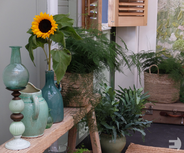 De tuin van Daubigny van Vincent van Gogh is de inspiratiebron voor de Groene kamer in het huis van Groene Kamer van Ariadne At Home op de VT Wonen & Design Beurs. Van Goghs kunstwerk de tuin van Daubigny is aan een zijde van de kamer wandvullend opgeblazen. De andere muren zijn in twee verschillende kleuren groen geverfd. Het groen (Cottage Green en Green Tea) is hier rustgevend en geeft je het gevoel in de tuin met Van Gogh te zitten, kijkend naar zijn geschilderde bloemen. Samen met de zonnebloemen in de groene glazen vaasjes en de versieringen aan de muur is het een kamer geworden om te lezen en te genieten. Een schilderij van Van Gogh is hier geen schilderij meer maar een manier om te wonen en te leven. Het geeft rust en ontspanning en leert ons naar buiten kijken.