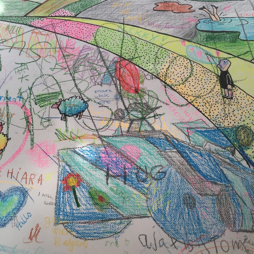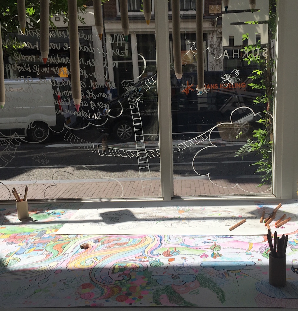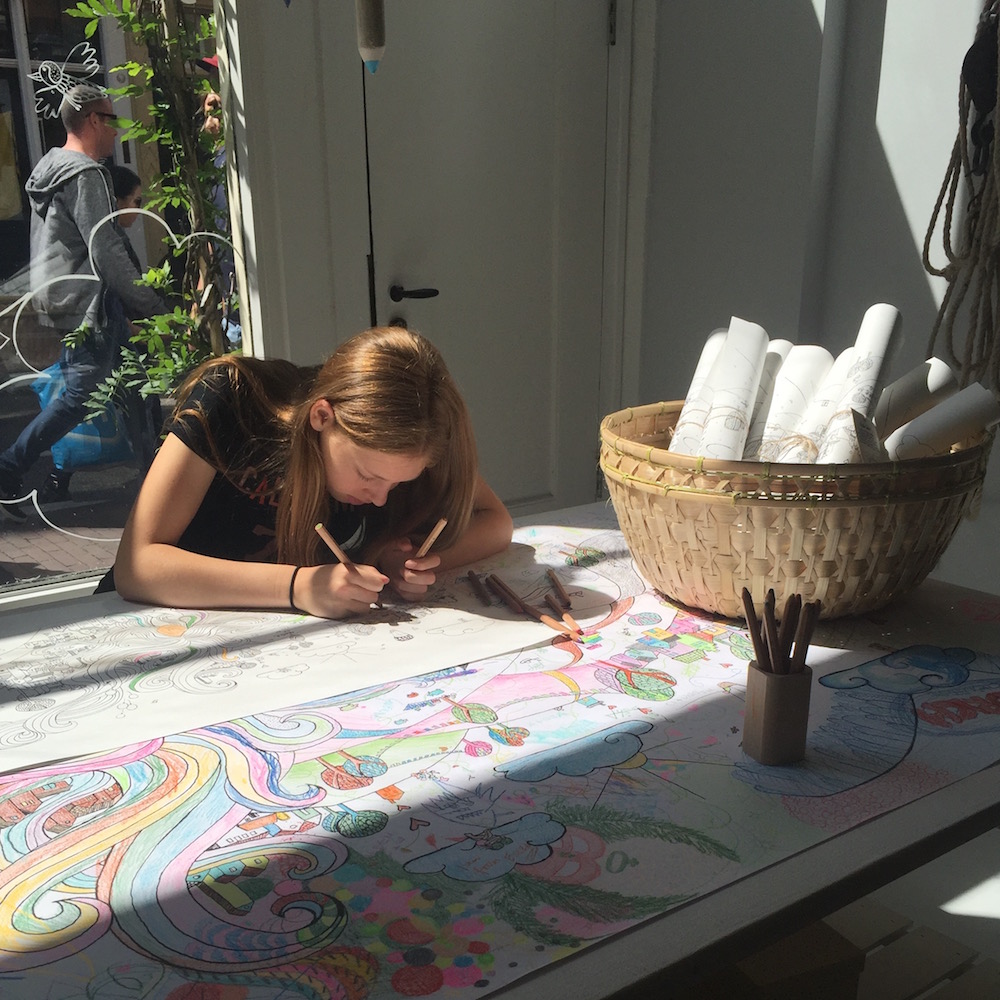 Dit keer lag er een enorme kleurplaat van bijna 2 meter in de etalage. De kleurplaat met een vrolijke illustratie is bedoeld voor gezamenlijk gebruik. De picknickbank en kleurpotloden nodigden iedereen uit even te gaan zitten en mee te kleuren aan deze collectieve kleurplaat.