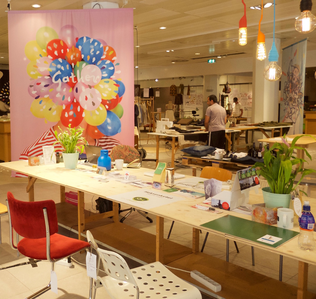 Letterlijk tussen de resten van de ‘oude retail’ van de V&D aan de Grote Houtstraat in Haarlem vind je het concept Gather. In een decor van omgebouwde kassablokken en stellingkasten tonen ontwerpers en designers hun producten. Elk presentatieblok heeft een eigen verhaal: in tekst, schetsen of materiaal.