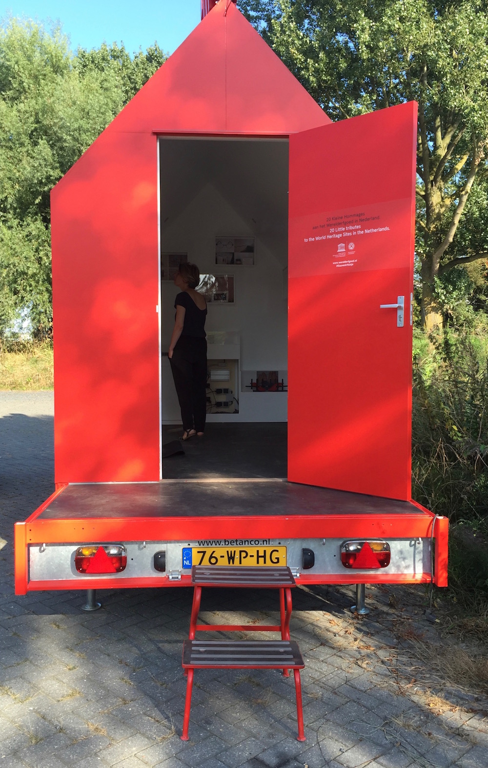 Het is half september, maar bloedheet. Ik sjouw over de verdedigingslinies van het Kunstfort in Vijfhuizen, op zoek naar iemand die de deur voor mij kan open doen, wil doen eigenlijk. Het lukt … ik mag zowaar naar binnen. De hitte overheerst in de kleine bouwkeet op wielen. In het huisje zijn 20 souvenirs geëtaleerd van de tien UNESCO-plekken in Nederland.
